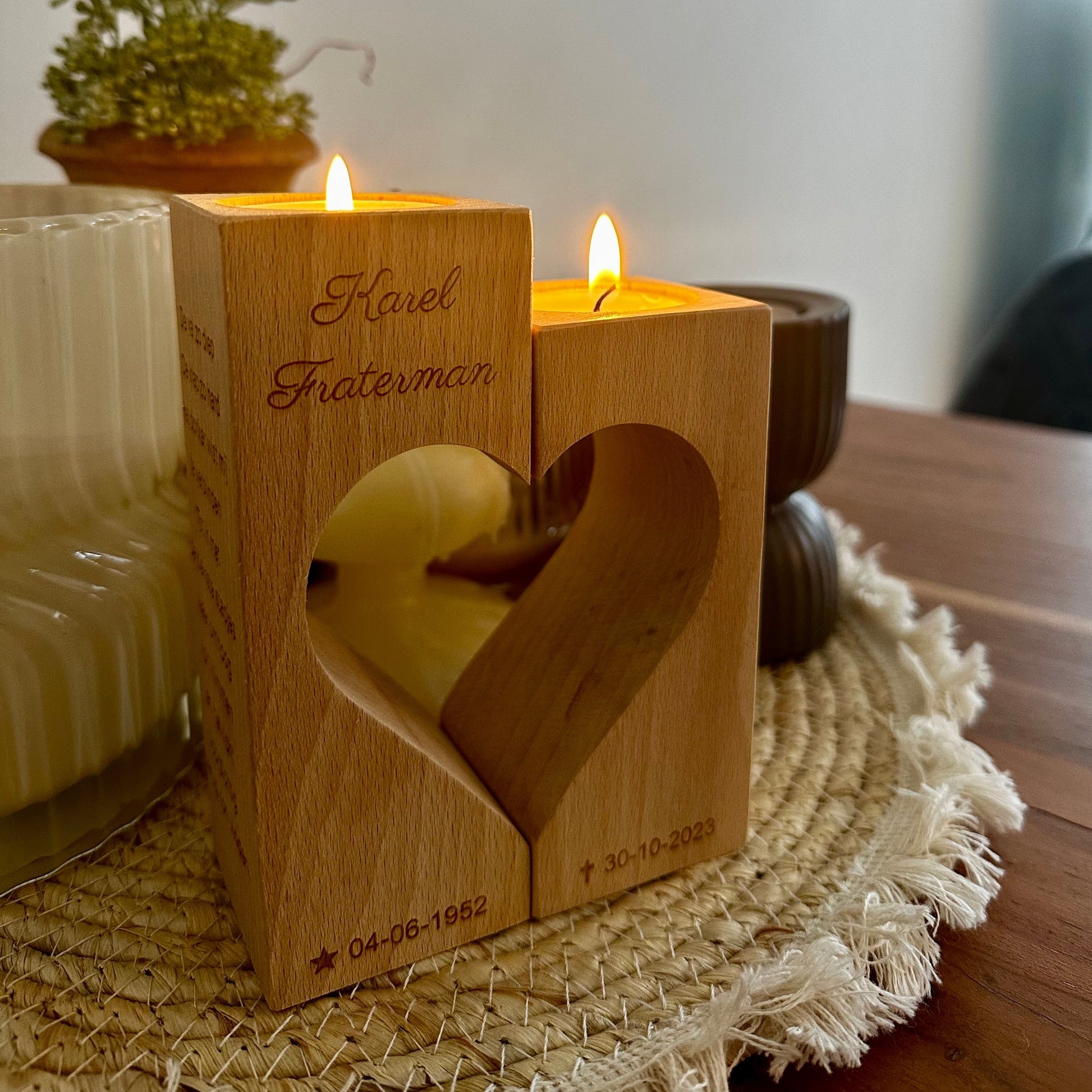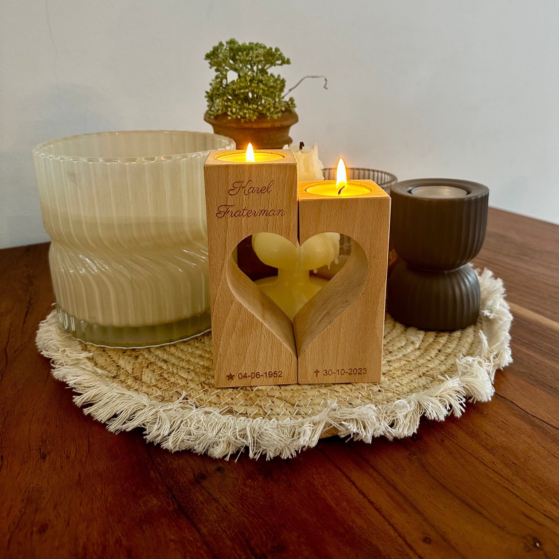 Creëer een warme en liefdevolle sfeer in je huis met onze hartvormige waxinelichthouder. Deze houder is niet zomaar een decoratief item; het is een gepersonaliseerd eerbetoon aan de geliefden die je voor altijd in je hart draagt.